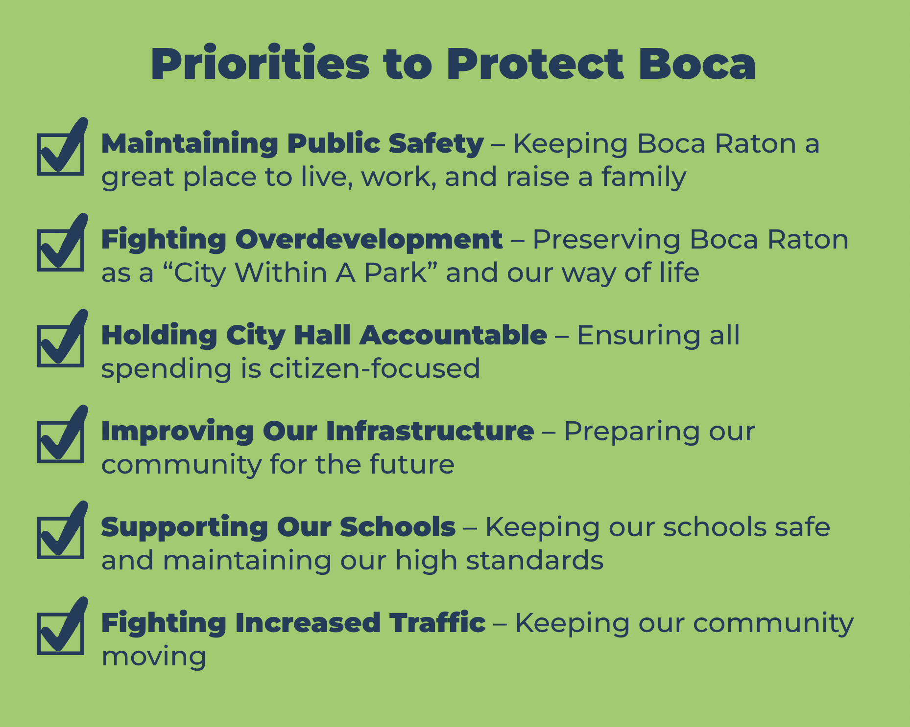 Jon is not taking one cent from developers or special interests and every decision he will make on the City Council will be for the betterment and preservation of our community. Just like he fought to save Memorial Park, he will fight every day for our best interests and to keep Boca a City Within a Park!